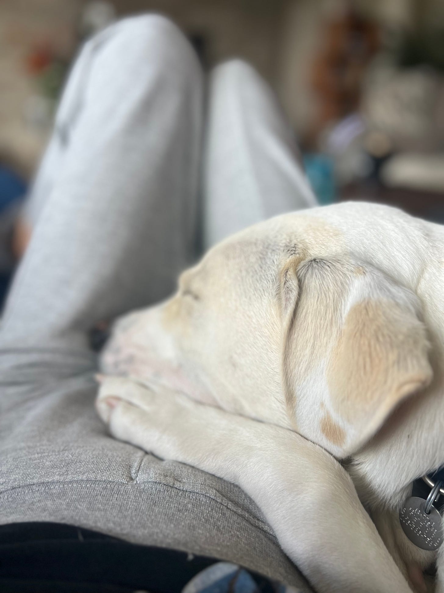 The dog is too excited to see me and keeps getting in trouble for trying to be too close. He eventually settles into a sweet caretaker rhythm, glued to my side as I navigate the walker in laps around the house, and then wriggling in to rest his big head on my shoulder or belly or thigh.